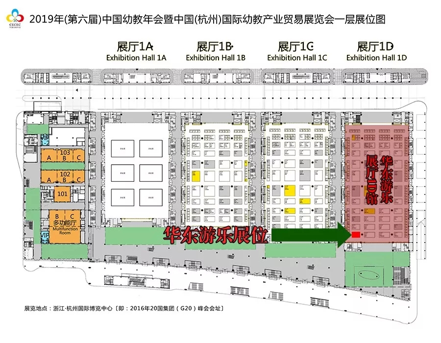 具体位置标示见下图(绿色箭头所指红色方框为乐鱼运动游乐展位):