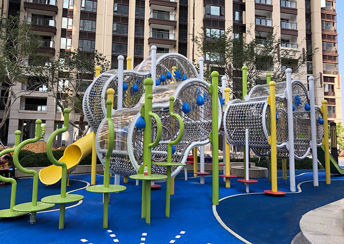 拓展类:这类设备就包括了天空之中在内的中大型爬网、沙地攀岩、大型组合滑梯、绳网步道、沙地滑索等等,相对运动程度较大,需要小朋友积极参与、勇于思考和摸索才能体验到乐趣的游乐设备。