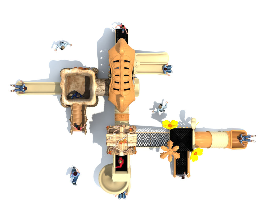 • 远古部落系列虽然名字带着“古”字,但是在设计细节处无不透露着艺术与创造性。当孩子在仿真树中探索、冒险、嬉戏游玩时,就像穿越到古老的神秘森林;粗略的树干包围着他们,头顶是高耸的茅草屋,触感真实的枯枝走廊,还有随处可见的小动物们…… 远古部落系列旨在打造区别于其他系列带给孩子们的新鲜感,让孩子们找设计者打造的神秘世界中获得冒险的乐趣。