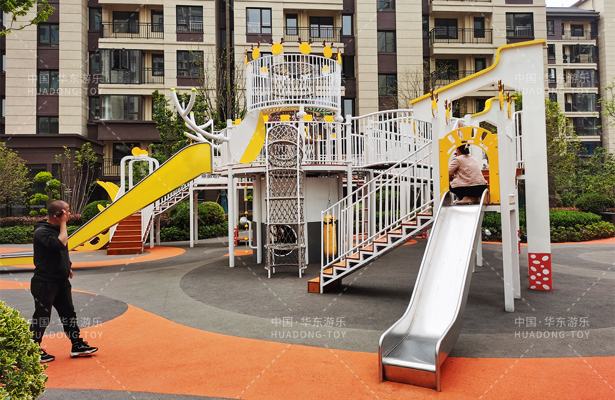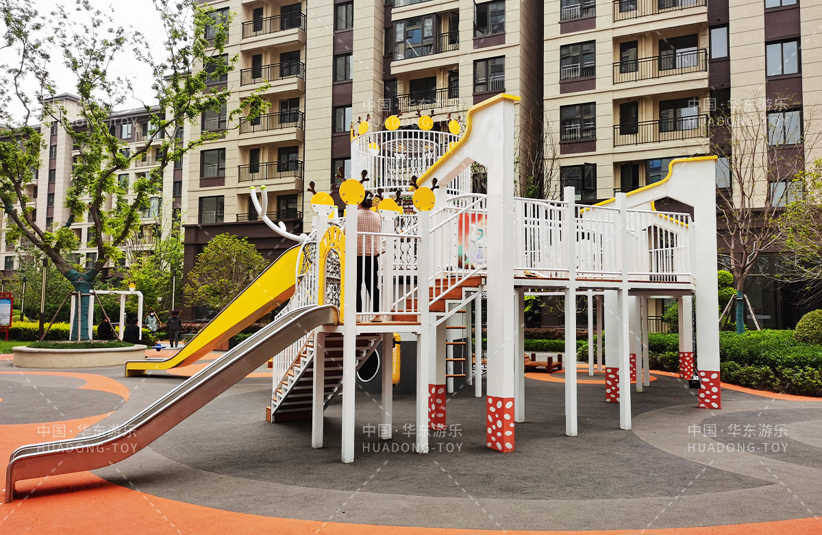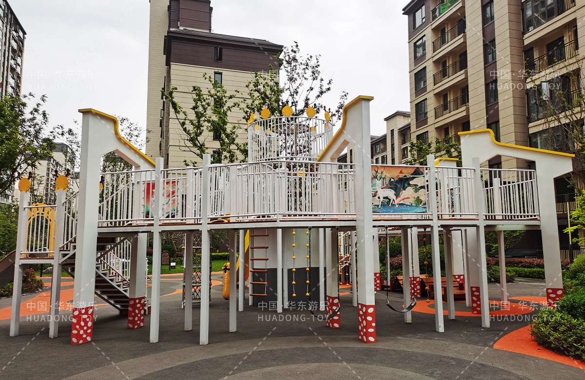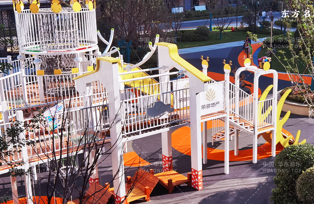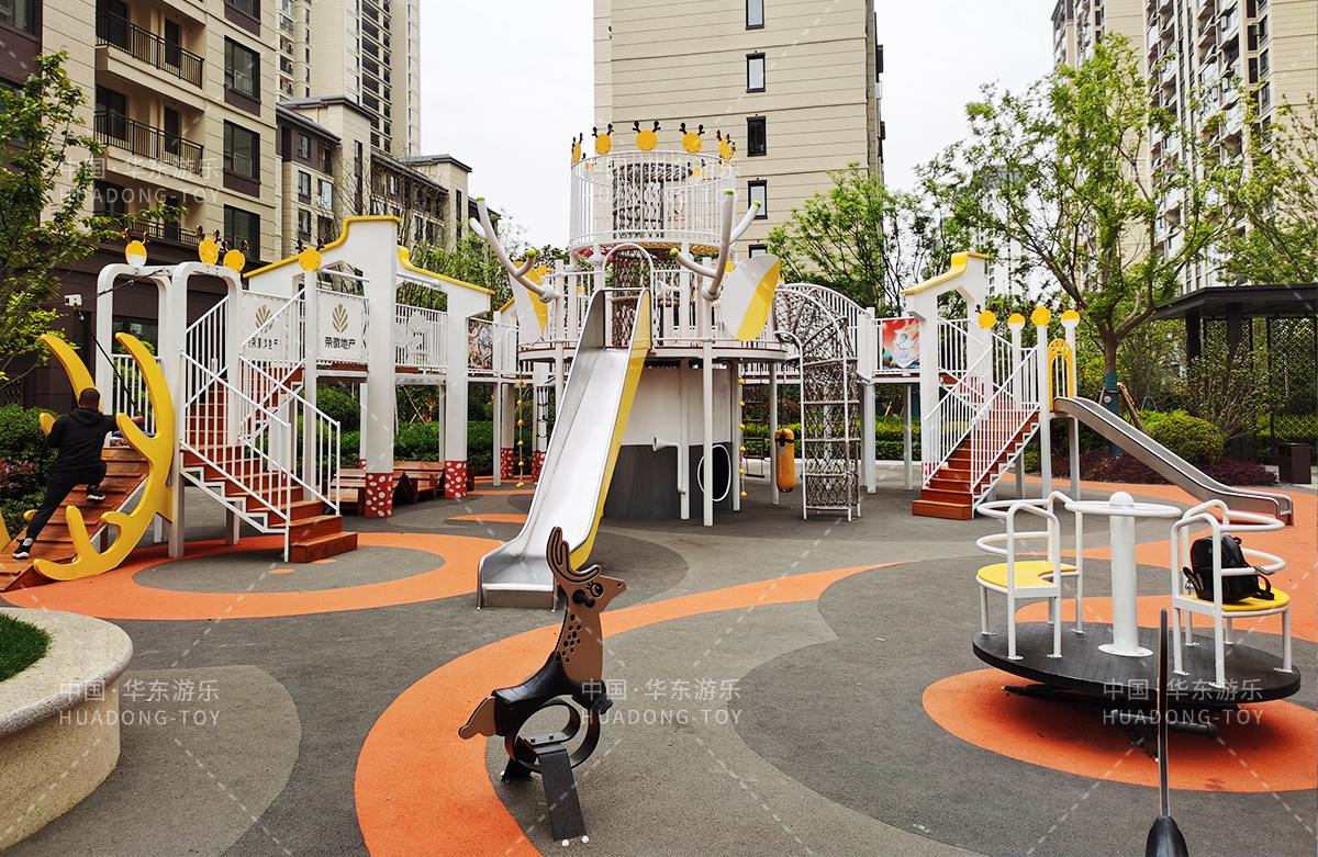 • 东方名府云著此次选用的是乐鱼运动游乐自主研发和生产的无动力游乐设备,采用的是以麋鹿为主题的综合性游乐园,整个游乐园分别设计了小朋友喜欢的儿童跷跷板、打击乐器、儿童摇摇乐,以及和具备不锈钢滑梯、攀爬网、攀爬绳、攀爬梯等功能的麋鹿组合滑梯等游乐设备。
