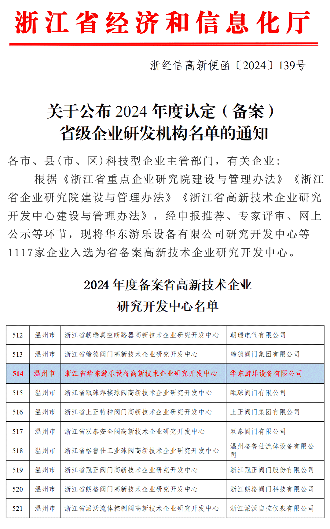 日前,浙江省经济和信息化厅发布的《关于2024年度拟认定(备案)省级企业研发机构名单的公示》,“乐鱼运动游乐设备有限公司研究开发中心”成功入选“浙江省高新技术企业研究开发中心”,标志着乐鱼运动游乐在科技创新和产品研发方面迈上了新的台阶。